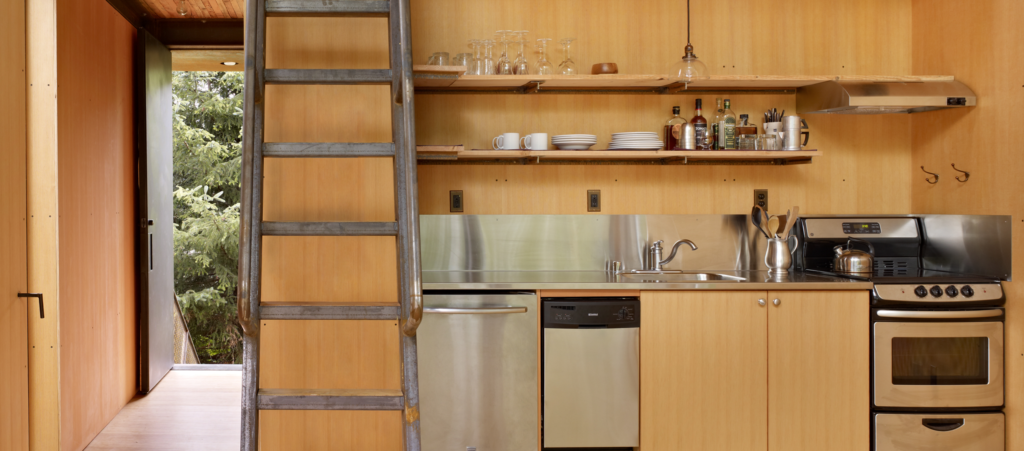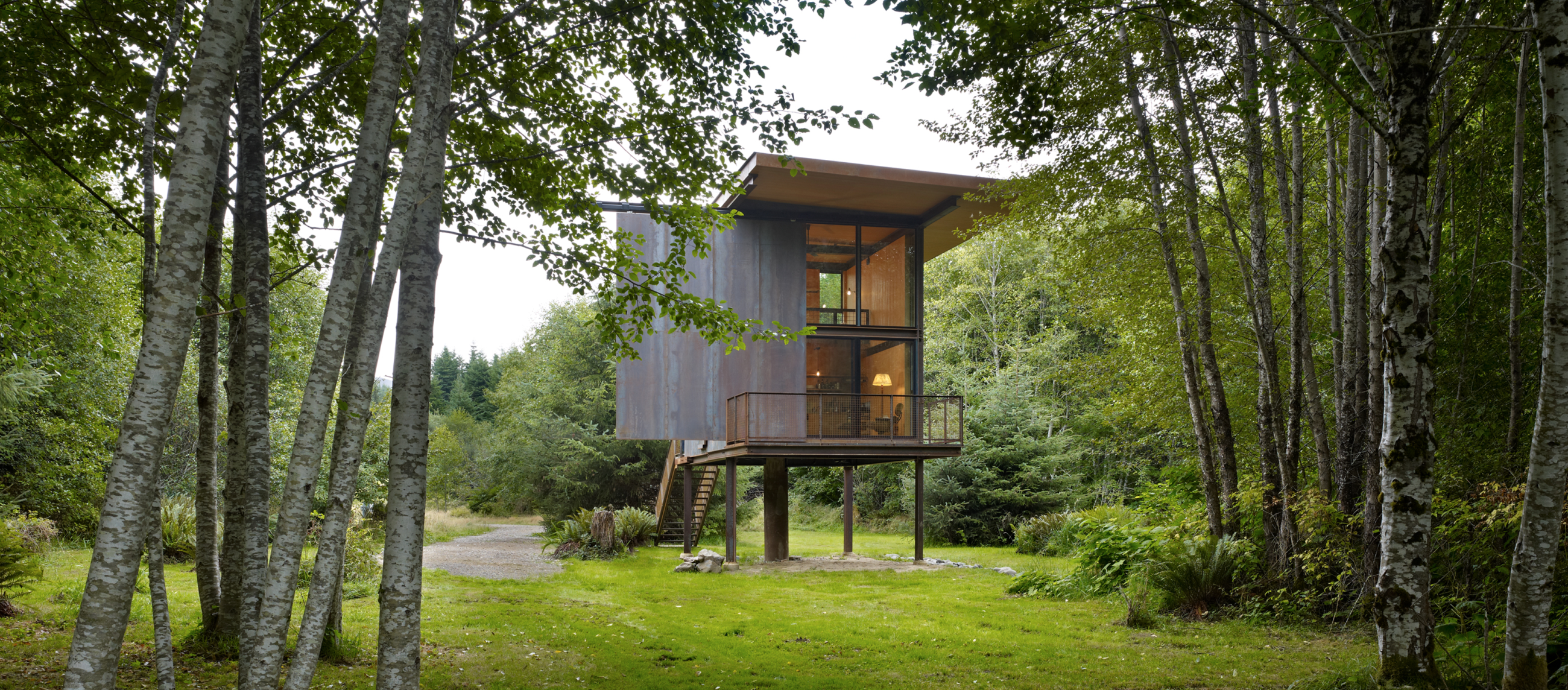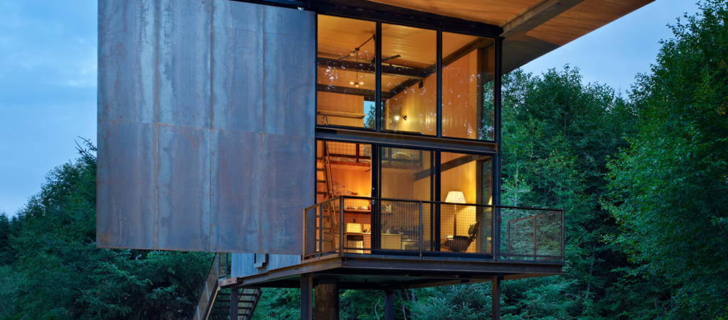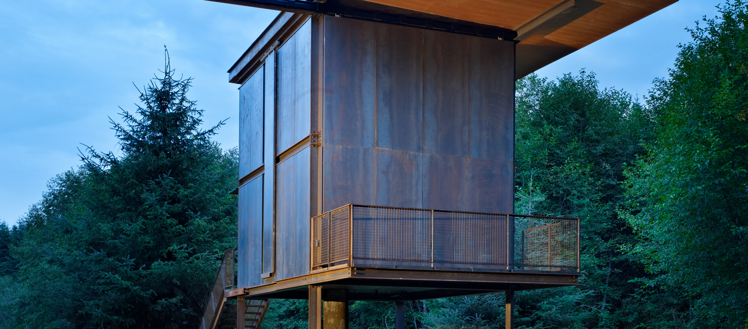 This steel-clad 350-square-foot cabin on stilts designed by Tom Kundig, can be completely shuttered when the owner is away. Most of the structure was prefabricated offsite, thereby reducing on-site waste and site disruption. Prefabrication kept typical construction wastage to a minimum. The cabin's rugged patina and raw materiality respond to the surrounding wilderness while its verticality provides a safe haven during occasional floods from the nearby river. Sol Duc Cabin's cantilevered roof provides solar shading and protection from the strong coastal storms from the west