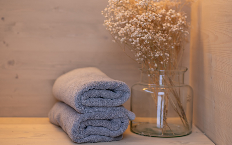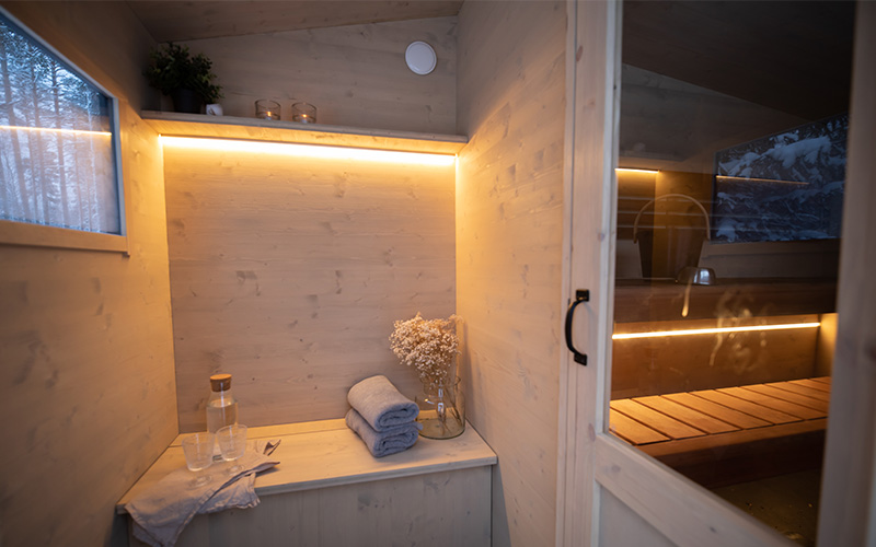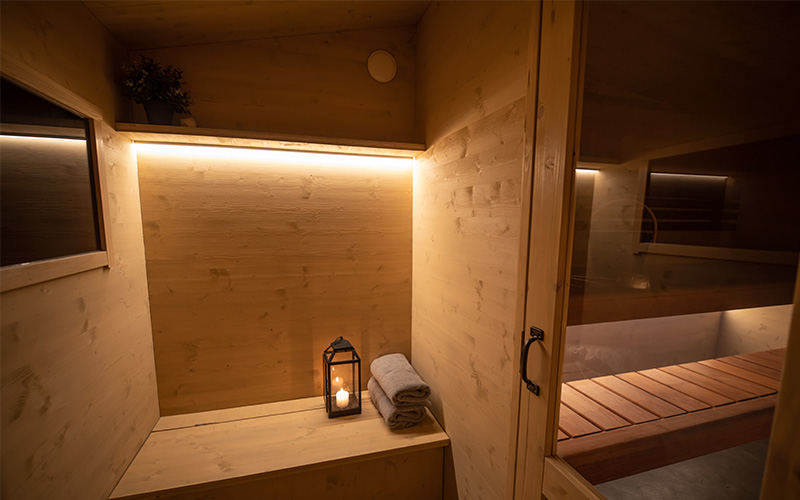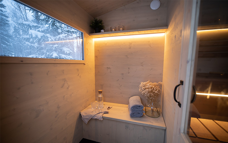 • In the sauna, Hi-Dry vinyl mat dark gray, slopings into the floor drain