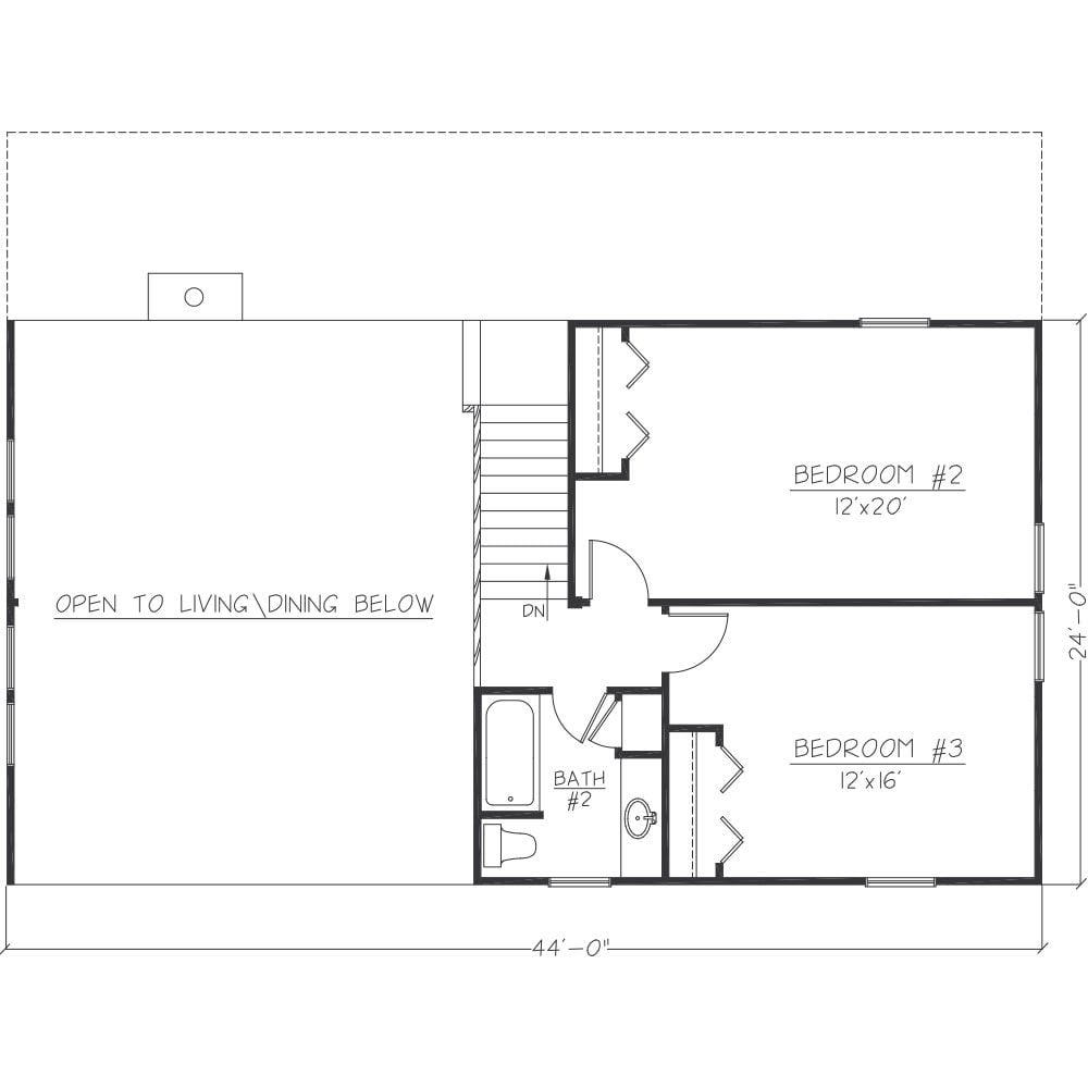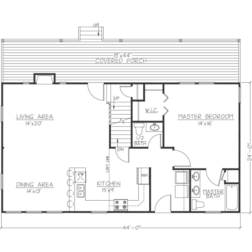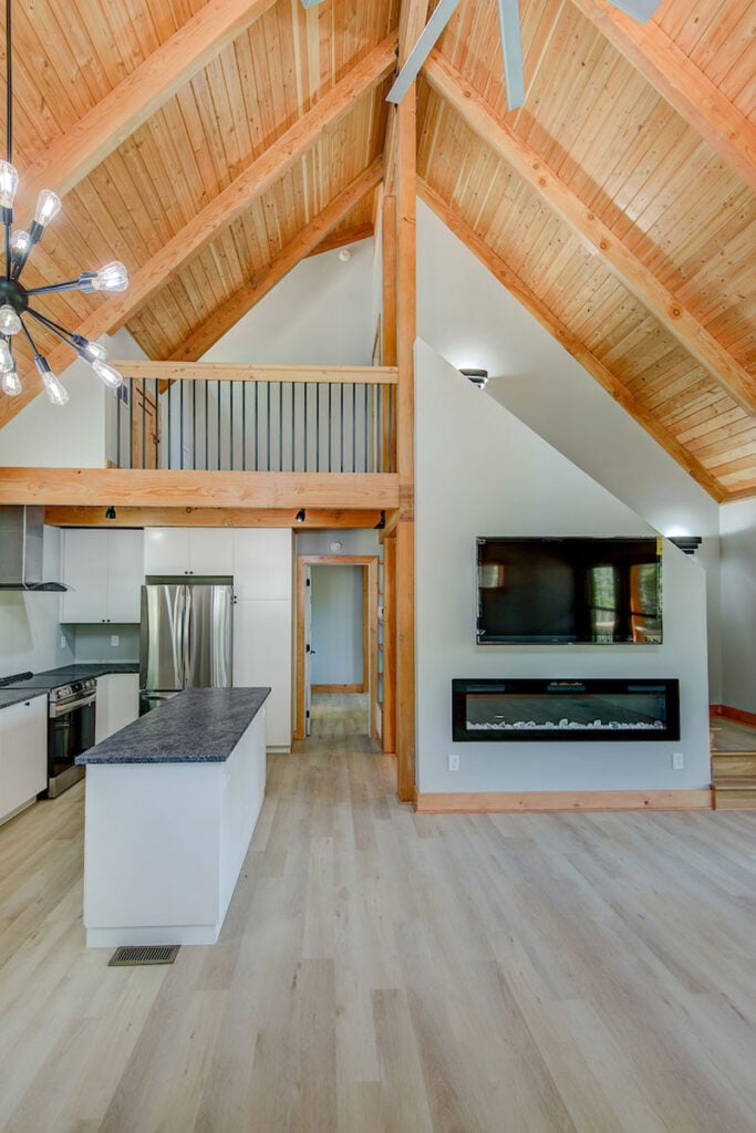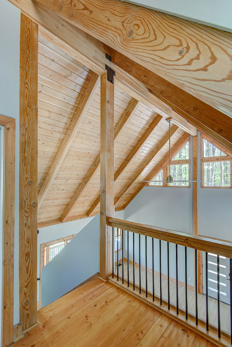 The covered porch features douglas fir rafters and tongue and groove ceiling welcomes you as you approach the front door. Once inside you are immediately hit with 22’ tall ceilings with the same Douglas Fir timbers. The openness and volume gives you sense of ahh and peace. This is home. This plan is 1450 sq. ft with 2 bedrooms down and the master up. Remember we can change the configuration of the post and beam home plan to make it yours. The Living Room is spacious 16×14, dining 16×10 and the kitchen is 11×9. Two bedrooms on the main floor share a full bath which is also available for your guests. Upstairs features the master bedroom with walk in closet and full bath. This design also has a balcony great for study or kids’ area. This entire area is completely vaulted with same douglas fir timbers and Tongue and Groove ceiling giving you tons of volume and space. Our post and beam home plans are either 24 or 28 feet deep and then we work in 4’ increments, i.e. 24×36, 40, 44 etc. Customizable and beautiful.