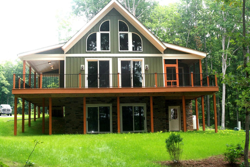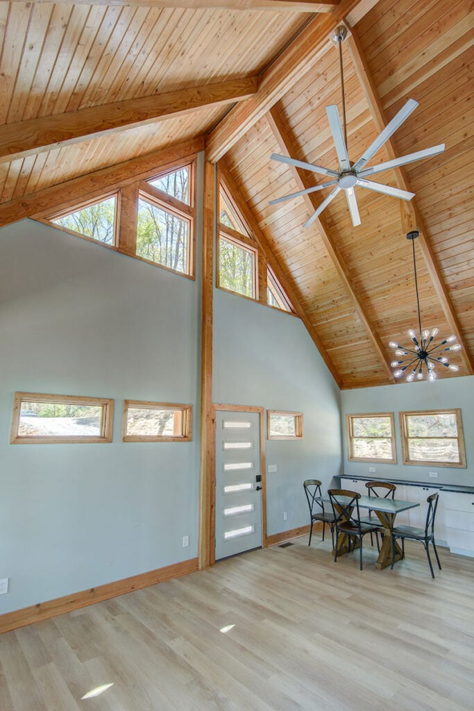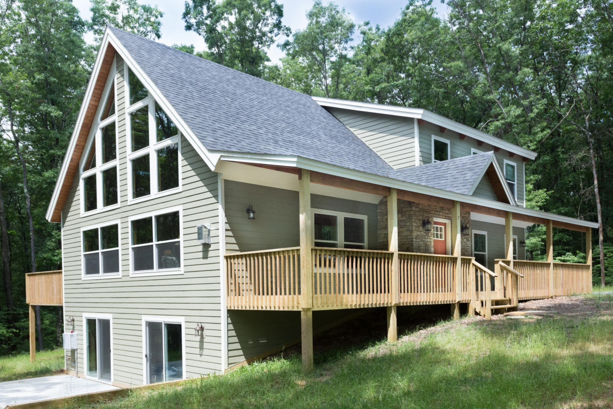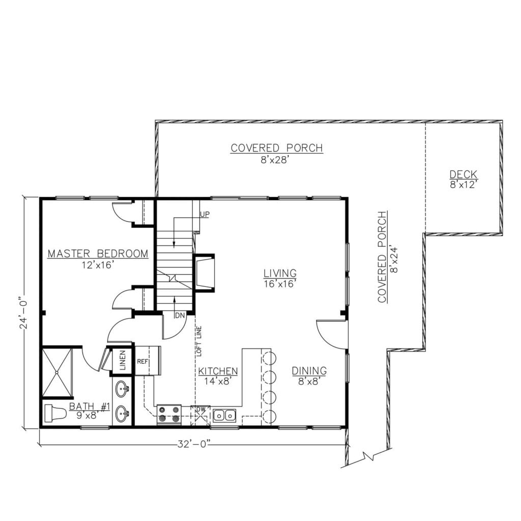 The covered porch features douglas fir rafters and tongue and groove ceiling welcomes you as you approach the front door. Once inside you are immediately hit with 22’ tall ceilings with the same Douglas Fir timbers. The openness and volume gives you sense of ahh and peace. This is home. This plan is 1450 sq. ft with 2 bedrooms down and the master up. Remember we can change the configuration of the post and beam home plan to make it yours. The Living Room is spacious 16×14, dining 16×10 and the kitchen is 11×9. Two bedrooms on the main floor share a full bath which is also available for your guests. Upstairs features the master bedroom with walk in closet and full bath. This design also has a balcony great for study or kids’ area. This entire area is completely vaulted with same douglas fir timbers and Tongue and Groove ceiling giving you tons of volume and space. Our post and beam home plans are either 24 or 28 feet deep and then we work in 4’ increments, i.e. 24×36, 40, 44 etc. Customizable and beautiful.