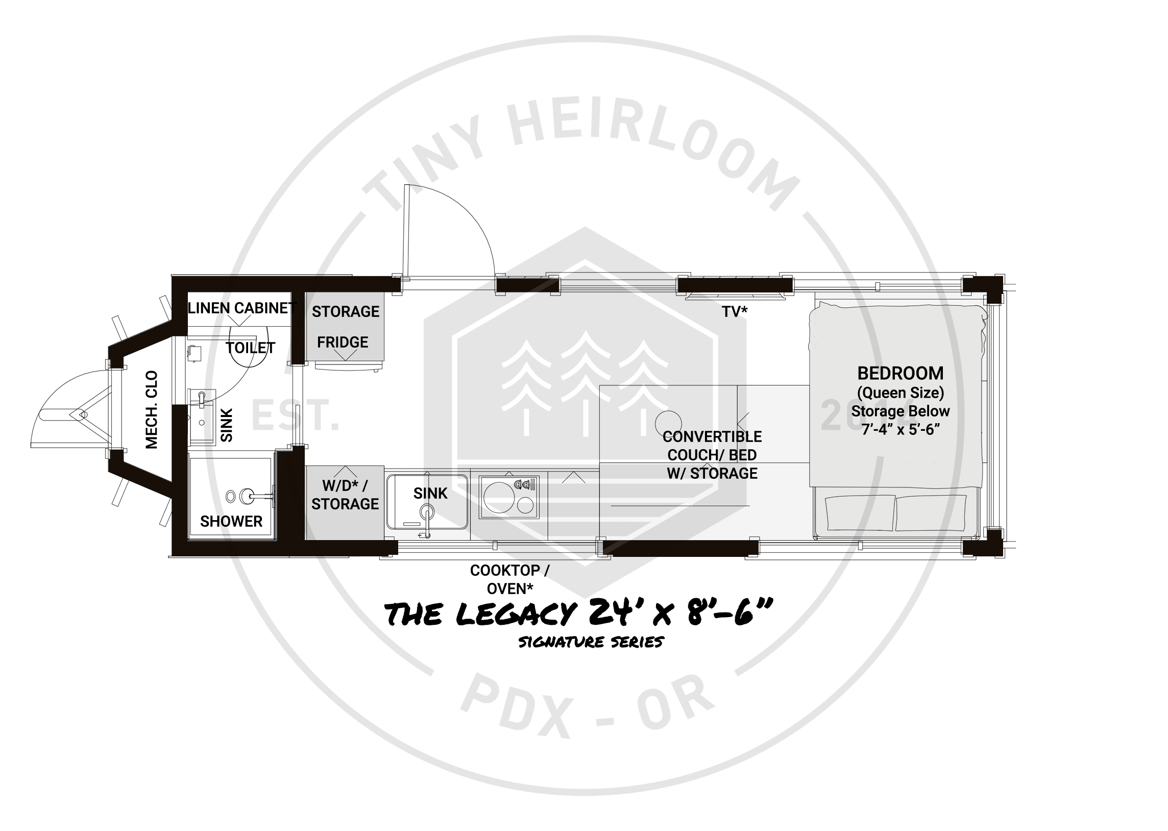 The Legacy is a re-birth of our hottest-selling model, the “Vantage”. Keep in mind this was built for the everyday traveler. We took the time to create not only a simplistic and clean design, we have now added sleeping for 4. That’s right, not only does this unit take advantage of the amazing views through the oversized windows throughout the main cabin, it is also our lightest unit to date, coming in at just under 10,000 pounds. At 24ft long, this unit will allow you to travel in style!